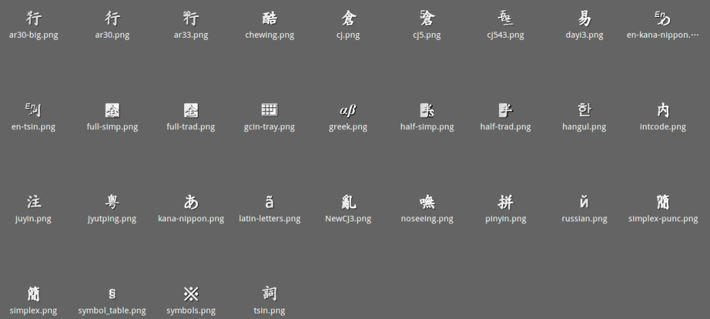 在 /usr/share/pixmaps/gcin 安裝在系統的套件,Debian/Ubuntu 可用下面指令查套件的檔案與位置 $ dpkg -L gcin