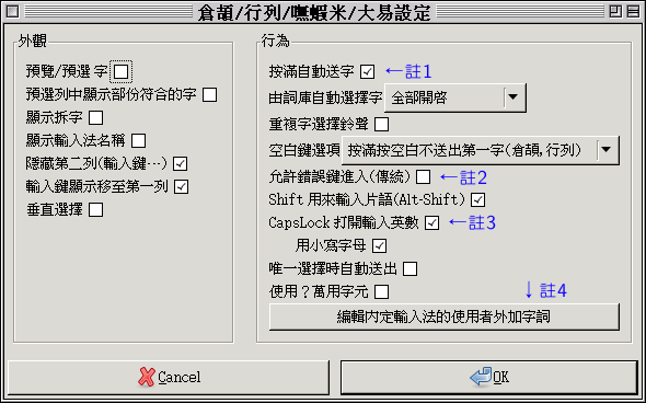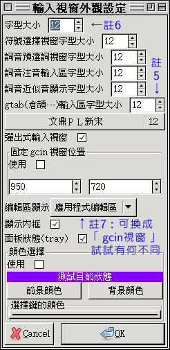 當然,微軟新倉頡比起gcin而言,也有一些相對的優點, 如:新倉頡本身的基本功能以及輸入法整合器裡的各種查詢模式...等, 自動學習: 期待有一天,gcin應該也會加入這個功能。 以下是小弟幾個常用的gcin功能, 合併gtab的由「詞庫自動選字」功能,我拿來和微軟新倉頡2003比較, 扣除二者相同或相似的功能後,列出gcin目前的相對優點, 順便在補充說明的部份列出設定方式,方便新進的gcin同好快速上手。 Gcin倉頡 (詞庫自動選字) 微軟 新倉頡2003 設定或開啟的選項 優勢 拆碼按滿後自動送字 ˇ ㄨ (如圖,註1) 減少手指負擔 自動阻擋錯誤拆碼 ˇ ㄨ (如圖,註2) 減少拆碼錯誤。 按Capslock切換為英文輸入 ˇ ㄨ (如圖,註3) 快速切換中/英文。 新增/自訂字、詞或符號的拆碼 ˇ ㄨ (如圖,註4) 想自創某些字、詞或符號的倉頡碼嗎?這是超彈性的自訂功能!可以自訂拆「star」輸出「★」、自訂拆「happy」輸出「快樂」...依此類推,透過這個功能,您可以更有效率地輸出某些字串或特殊符號。 調整拆碼區字型大小 ˇ ㄨ (如圖,註5) 可視需要把字型放大,減少視力的負擔。 緩衝區獨立並可調整字型大小 ˇ ㄨ (如圖,註6、7) 可視需要把字型放大,減少視力的負擔。 按空白鍵送出緩衝區的字 ˇ ㄨ 打完字按空白鍵即可送字。 不必移動手指去按Enter,增加打字速度,也減少小指的負擔。 邊打邊發音 ˇ ㄨ (如圖,註8) 為視力不好的朋友或是習慣盲打的使用者提供良好的校正輔助工具。 打繁出簡 ˇ ㄨ (如圖,註9) gcin在輸出字時,自動將繁體字轉成簡體字,省得自己去作簡繁轉換,也不用花時間學簡體輸入法,省時省力。 同音字查詢 ˇ ㄨ 按「`」再打即可 可以用同音字來找到比較難拆的字,如:可用「賓」來查詢拆碼並輸出為「斌」,減少「不會拆碼而打不出來」的情形。 Ctrl+數字新增自訂詞 ˇ ㄨ 在緩衝區把游標移到欲新增的詞之後,再按Ctrl+數字即可。 快速加入自己常用詞到詞庫中。 自訂{shift+某鍵}輸出符號或字串 ˇ ㄨ (如圖,註10) 提供快速輸出符號或字串的方式。 自訂{ctrl+某鍵}輸出符號或字串 ˇ ㄨ (如文,註11) 提供快速輸出符號或字串的方式。 可更換佈景主題 ˇ ㄨ 參考資料 讓打字界面也有賞心悅目、改善心情之效。 每日打字量統計功能 ˇ ㄨ 討論一、討論二 除了看看自己每天手指有多操勞以外,看到自己每天數千字的輸字量,可提升個人成就感。 修改輸入法規則或自創輸入法 ˇ ㄨ 製作或修改輸入法,並輸出為gcin可用的gtab格式 如果對現行使用的倉頡輸入法任何方面不滿意,可以下載並編修倉頡表格檔(cj.cin),可修改其中的功能細節、新增或修改拆碼規則、加入特殊符號或罕用字...等,真正達到把輸入法「為您量身訂作」的境界!實例:亂倉打鳥、四碼倉頡、三碼倉頡、五四三倉頡 。 註8: 註9: 註11: gcin預設可以用{ctrl+某鍵}來輸出常用符號,如{ctrl+,}就輸出「,」,以此類推。 如果想要自訂的話,可用文字編輯器編輯下面這個檔。(如果沒有這個檔,就新增一個)