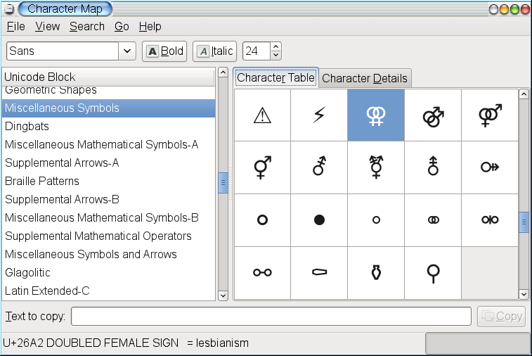 Gender Symbol(性別符號)。以下這裡有詳細解釋: http://unicode.org/charts/PDF/U2600.pdf 不過一堆字型都沒有,你是用什麼字型才能顯示的?
