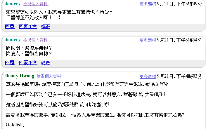 我真的是傻眼了,醫德和醫術之爭會蹦出這句話:「醫德能救人嗎?」!