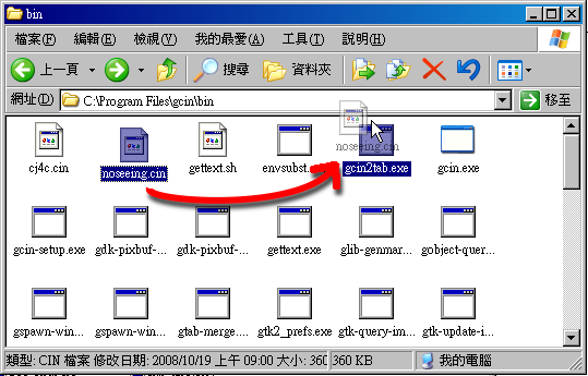 以滑鼠將noseeing.cin拖曳到gcin2tab.exe