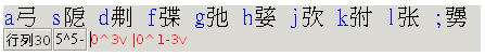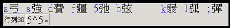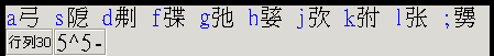 我將 ar30.cin 前面 %selkey 1234567890 改成 %selkey asdfghjkl;,在 windows 下轉成 gtab  檔後執行。行列按 tg 本應出現下面第一張圖,結果出現如第二張圖的錯誤字碼。後來發現 %selkey 中的 g 改回 5 或 t ,就不會有亂碼。%selkey 改成 gasdfhjkl; 也會有亂碼。可能 %selkey 只要有 g 就會產生。cin 檔已轉成 dos 格式。