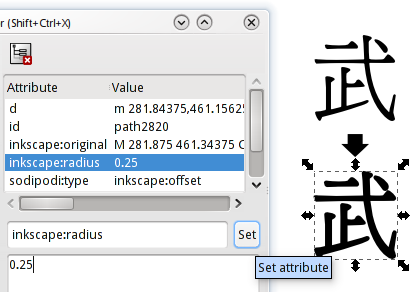 動態偏移可讓使用者自行控制偏移的程度,但遇到複雜或小路徑用滑鼠會很難控制,這時可利用 XML 編輯器輸入擴張的數值。