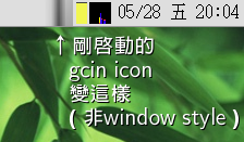 感謝eliu兄幫忙,非windows style的gcin-tray.png也能自動縮放了, 不過今天發現一個小問題,如果沒啟用windows style的話,第一次啟動gcin時,gcin-tray.png會變成一塊灰色區塊,如下圖: