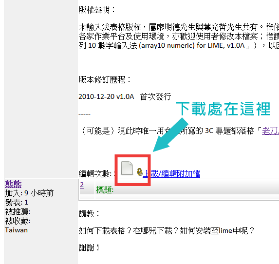 本輸入法表格版權,屬廖明德先生與葉光哲先生共有。惟依行列輸入法公開授權使用之精神,歡迎各位朋友引用、散布(複製)。為使本輸入法符合各家作業平台及使用環境,亦歡迎使用者修改本檔案;惟請於所修改之原始檔或說明文字中,註明檔案來源及版次資訊(如:「本輸入法係修改自行列 10 數字輸入法 (array10 numeric) for LIME, v1.0A」),以因應未來本輸入法表格版本後續更新時,可提醒修正者或使用者配合維護。