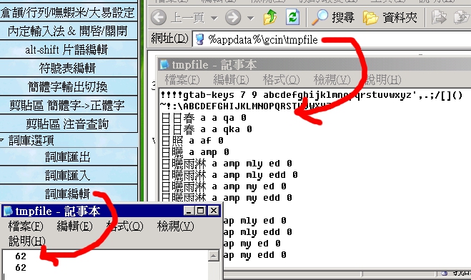 點了gcin-setup的「詞庫編輯」後,只看到記事本是開了tmpfile,裡頭只有2行「62」字樣。