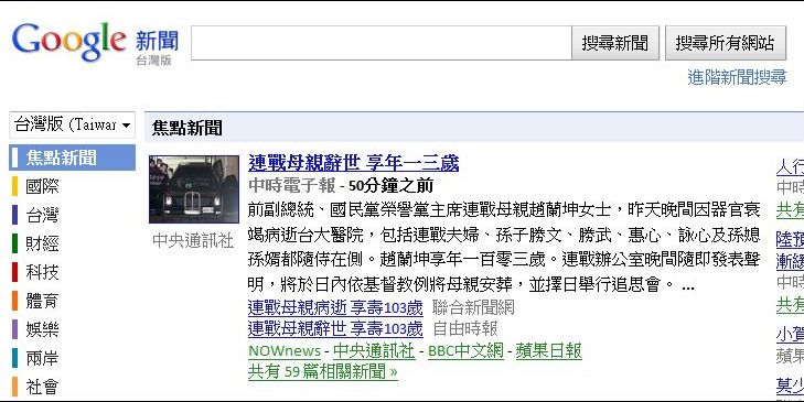 Google News 顯示 中時電子報:連戰母親辭世 享年一三歲