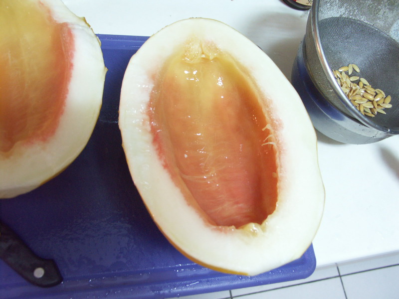買到一顆很熟的狀元瓜,一切開,裏面很多水&子就流出來。美濃瓜的水可以用濾網喝,狀元瓜的水味道有點怪。