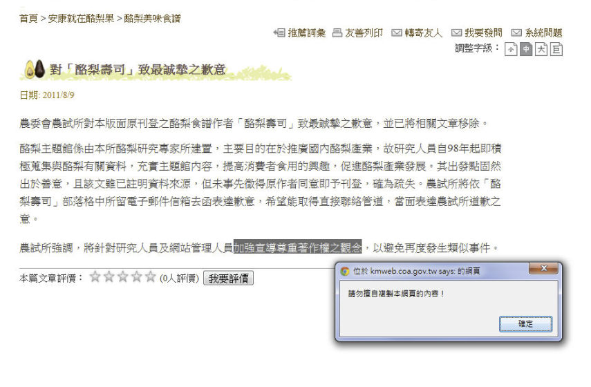 還有,在網頁按滑鼠右鍵,或 Ctrl+C,還會出現「請勿擅自複製本網頁內容」的訊息