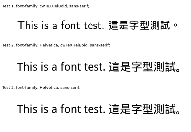 回到上圖,在 .test2 中,firefox 6.0 用 Liberation Sans 顯示英文,用 AR PL New Sung 顯示中文,這代表 firefox 6.0 並沒有 fallback 到 .test2 的 cwTexHeiBold,而是用了 Helvetica。
