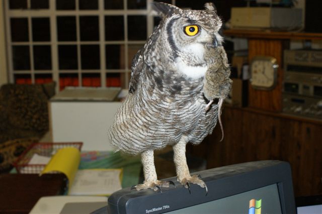 南非的 Chris Pretorius 4年前照顧一隻受傷的貓頭鷹( spotted eagle owl) 兩個月後野放。這隻貓頭鷹白天在家裡睡覺,晚上帶它的獵物(老鼠、蛇、蝙蝠) 回家給他、他的妻子、寵物貓、其他受傷的貓頭鷹…