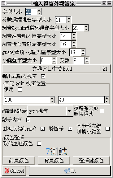 小弟移除舊的~/.gcin後,以gcin的預設值來用,的確沒有切掉的情形, 試了T大的設定方式(如T大的附件),也沒有切掉的情形, 不過一旦改成「彈出式視窗」,問題又會再重現,真遺憾...