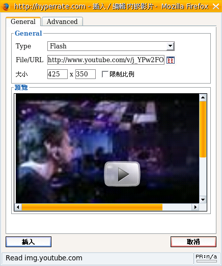 可以直接貼上 youtube 這個影片的 URL,tinymce 會自動把 embed 內嵌的 URL 抓出來,不過只限英文版,中文tw.youtube.com不能用,把 tw 拿掉就可以。用 embed URL 也可。 貼上之後,直接點選預覽區,就會看到預覽區的影片,沒問題的話按「插入」。