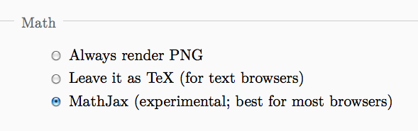 今天看見一個名叫 KaTeX 的 javascript 專案,一樣也是在網頁上呈現數學式的 javascript 工具,特色是它比 mathjax 的 rendering 快「非常多」,並且採用 MIT 授權。缺點大概是在書寫 html 碼時若需要輸入大量的數學式可能不會像 mathjax 方便。