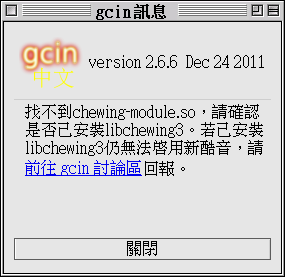 但內碼和新酷音目前還沒有,所以一般使用者切換不過去時,大概也搞不清楚是怎麼回事,也許有人沒耐心,就直接移除gcin了。如果可以比照anthy的方式把錯誤訊息投到一個小視窗(甚至加上簡要說明的話),應該會有助於使用者自己解決問題。