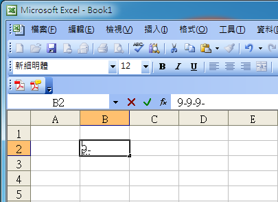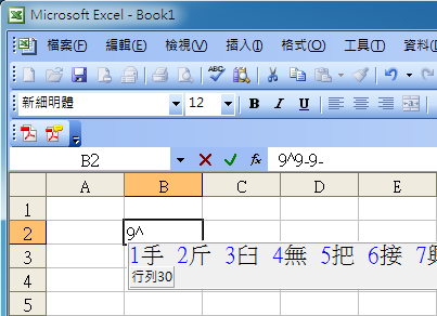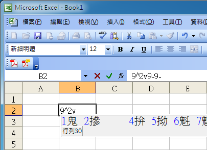 To eliu: 我以使用行列輸入法打入「我」字為例(行列拆碼為 lox),將 Excel 2003 的畫面貼出來,請您參考一下: 首先,打入 l(小寫 l): 再來,輸入 o: 接下來,再輸入 x: 最後按空白鍵組字,結果就是送出「鬼」,而不是正確的「我」字。 請注意位於儲存格區上方的「資料編輯列」(即 "fx" 圖示右邊這一區),在一開始輸入 l 的時候,顯示就不正確了(不明原因地出現重碼)。如果把滑鼠在「資料編輯列」上點一下並在此列輸入文字,則行列輸入法的功能是正常的。 | |||||||||||||