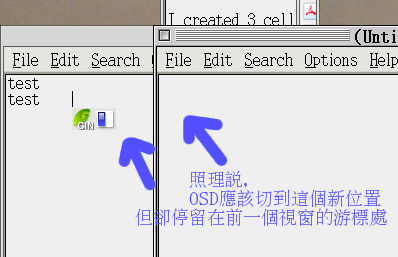 但是嚴格來說,「出現在前一個leafpad的打字游標處」這樣的說法並不正確, 正確地說,應該是「英數狀態的OSD,會跳到在前一個中文輸入狀態的AP視窗裡」。 假設視窗C是英數狀態,視窗D是中文輸入狀態,則我從視窗D切換到視窗C時, 英數狀態的OSD理應出現在視窗C裡,但是卻跑到視窗D中文輸入的游標位置去了,這就是昨天回報的情形。