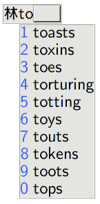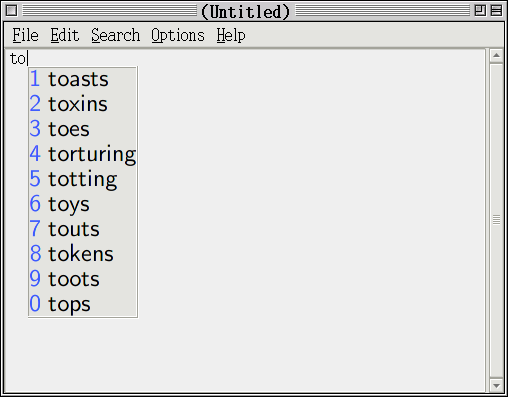 最近也在思考英文預選詞的問題。不過麻煩的是英文有大小寫,英文中夾雜數字很常見,!@#$%^&*() 這些符號也很常用,所以 shift 當預選詞的鍵行不通。 後來想到是用 ctrl-12345 來當預選詞的鍵。不過用 ctrl 似乎比較不好按。 在 Android 上預選詞就很好用,因為是直接用 touch 選擇,不用按鍵也可以。 words 就用 /usr/share/dict/words 就好了,是一個 symbolic link,在 ubuntu 會依 language link to american-english or british-english edited: 2