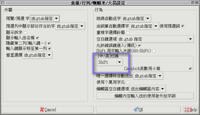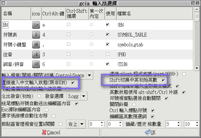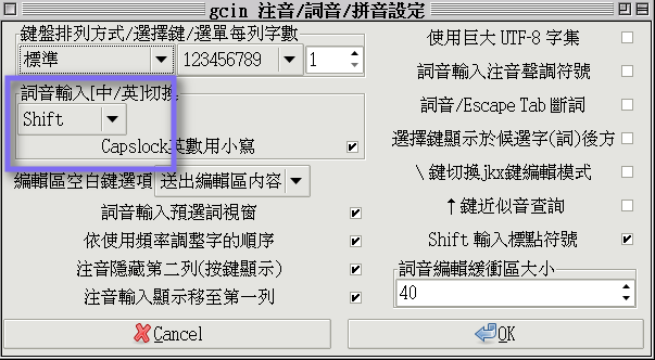 (2)確認詞音或gtab輸入法是設定用shift來切換中英狀態(gcin-tools→詞音設定→詞音中英切換選「shift」)