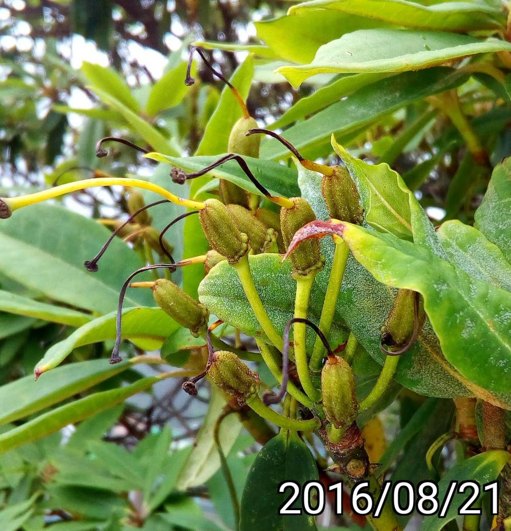 玉山杜鵑、森氏杜鵑的果實   fruits of Rhododendron pseudochrysanthum玉山杜鵑、森氏杜鵑的嫩芽苞    shoot buds of Rhododendron pseudochrysanthum玉山杜鵑、森氏杜鵑的葉子   leaves of Rhododendron pseudochrysanthum玉山杜鵑、森氏杜鵑樹 tree of Rhododendron pseudochrysanthum