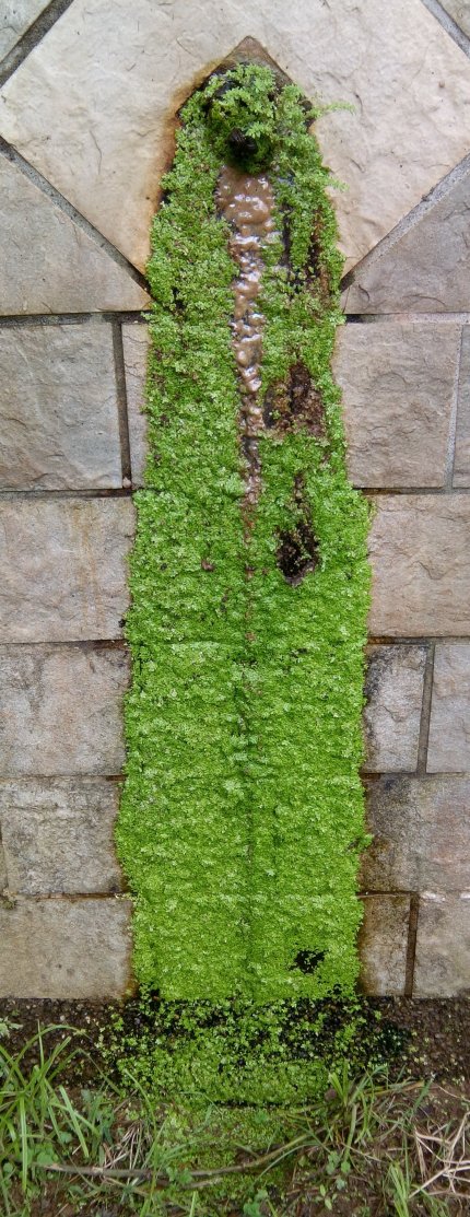 浮萍一般是漂浮在水面的,田裡很多。有沒有可能長在牆壁上?是可能的。牆壁流出的水必須很緩慢,浮萍的根就可以固定在牆壁上。或許可以設計一個有浮萍牆的花園 or 水池,應該很特別。