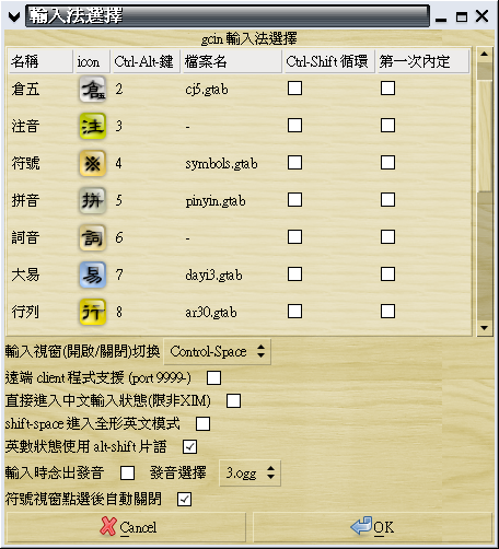 上面步驟利用一個script來取代原有的gcin執行檔,目的就在於此。(參考資料