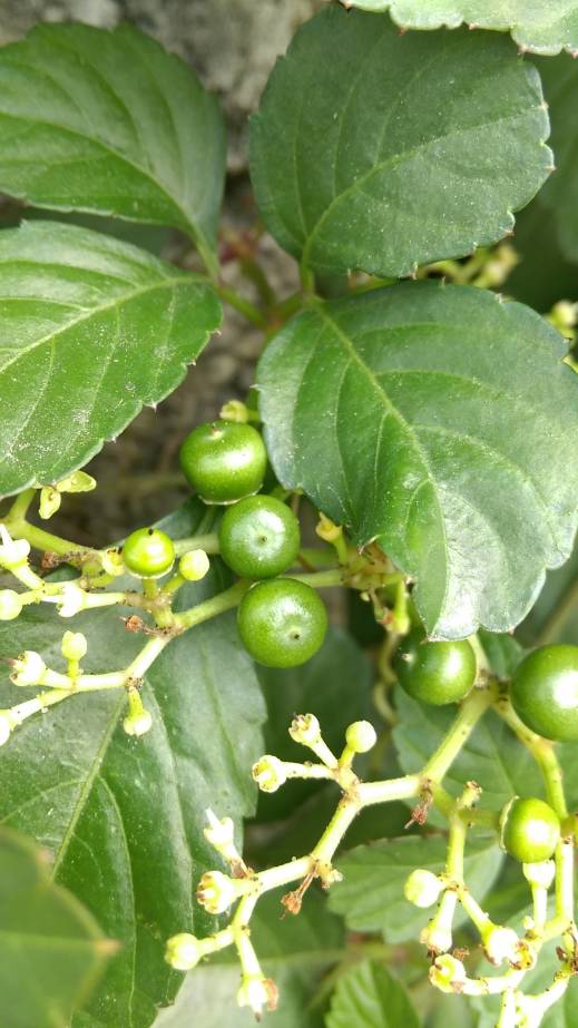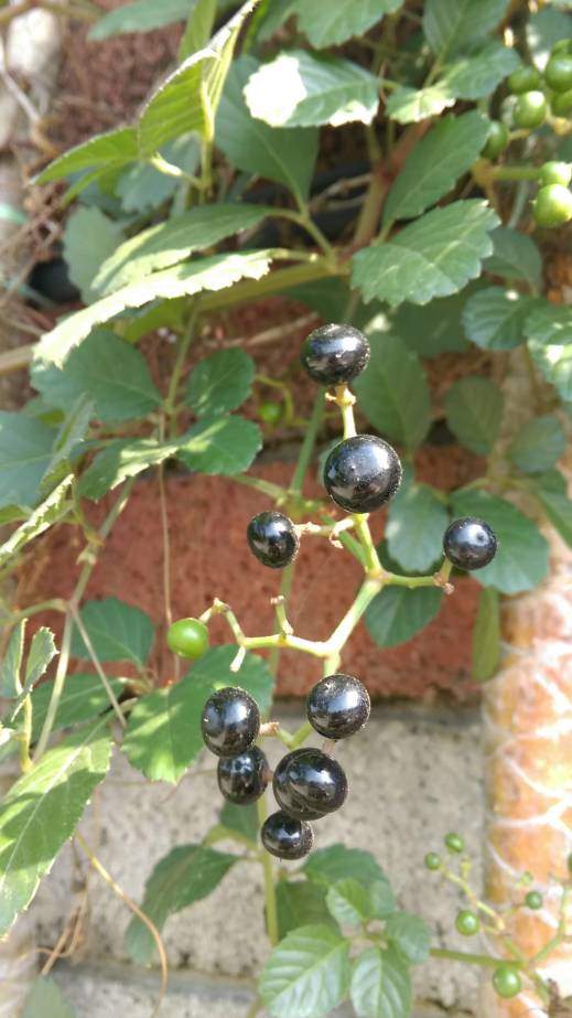 會爬牆的藤蔓類,2-3mm 的黃色小花,成熟的果實是黑紫色。