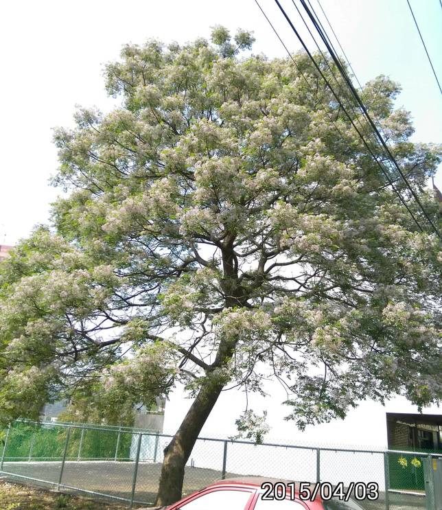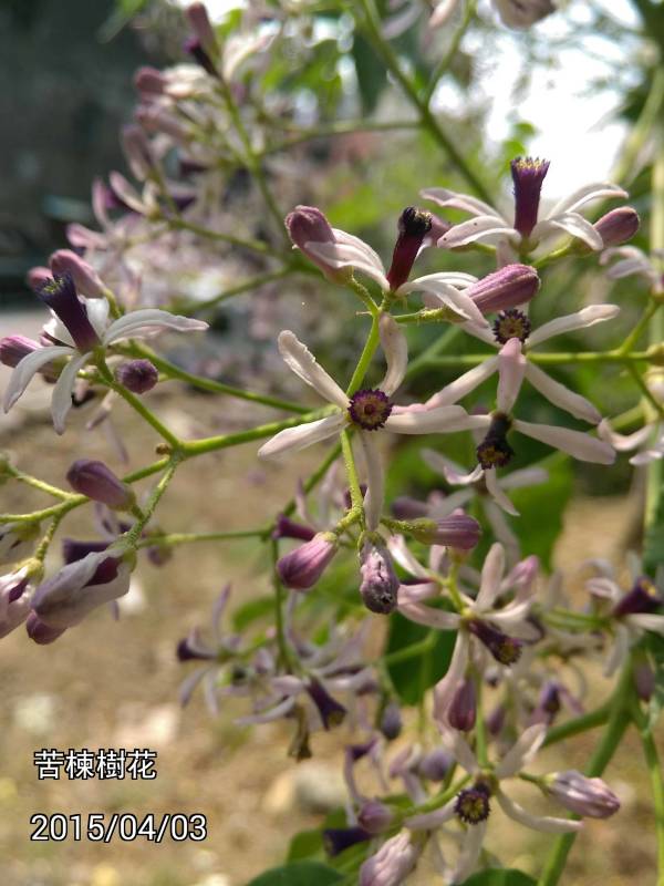 特徵:大樹,4-5月花瓣白色&中心花蕊紫色的小花,成熟的果實是黃色的中文名稱:苦楝樹英文名稱: white cedar, chinaberry tree, bead-tree, Cape lilac, syringa berrytree, Persian lilac, and Indian lilac學名:Melia azedarach原產地:東亞、澳洲