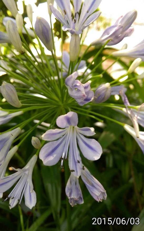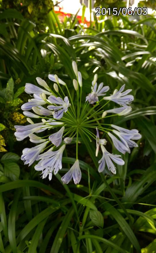 特徵:花瓣有藍紫色縱向線條,其餘的部份是淡藍紫色。葉子類似石蒜科的植物中文名稱: 百子蓮、藍紫花石蒜、藍百合、非洲百合 學名:Agapanthus praecox, Agapanthus africanus(?)英文名稱:Common Agapanthus, Blue Lily, African Lily, Lily of the Nile原產地: 南非