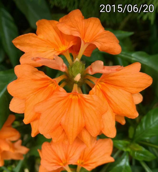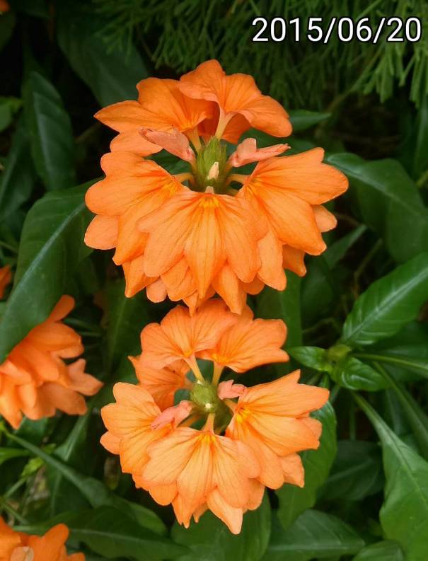 特徵:橘黃色的花,非圓形左右對稱的五瓣花瓣,葉子類似非洲鳳仙花中文名稱:鳥尾花,鞭炮花(下雨時果實爆開的時候)學名:Crossandra infundibuliformis英文名稱: firecracker flower(爆竹花)原產地:南印度、斯里蘭卡