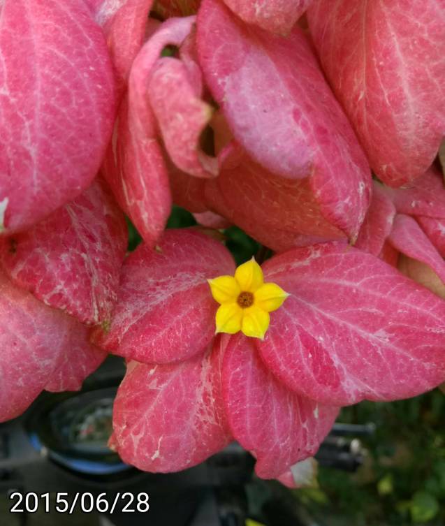 特徵:約1cm黃色的花,假花瓣是深粉紅色、紅色或是白色帶點黃綠色。有點類似聖誕紅一類的植物。有點類似九重葛,不過是歸類為茜草科(Rubiaceae)中文名稱:紅紙扇、白紙扇、紅旗木、白旗木學名:Mussaenda erythrophylla英文名稱:Ashanti Blood, Red Flag Bush and Tropical Dogwood