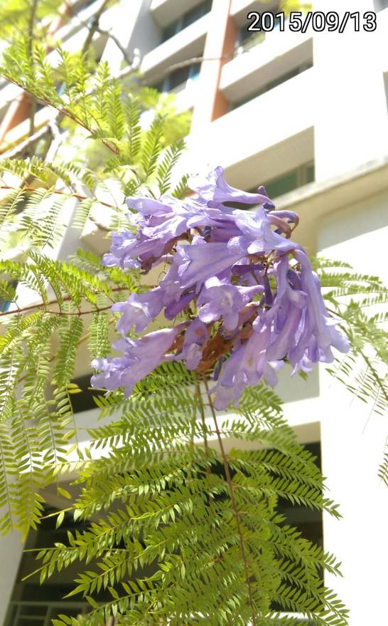 特徵:類似鳳凰木的羽狀複葉,花是紫色、藍紫色、中文名稱:藍花楹學名:Jacaranda mimosifolia英文名稱: jacaranda, blue jacaranda,black poui, or as the fern tree原產地:南美洲中南部