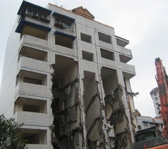 四川绵阳市一栋7层住宅楼,顶楼一户人家未搬,但楼下5层楼梯被挖掘机拆掉。进行拆迁的开发商表示,该拆迁项目是当地的灾后重建项目。