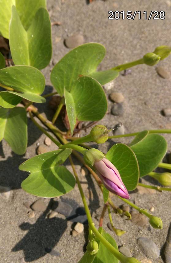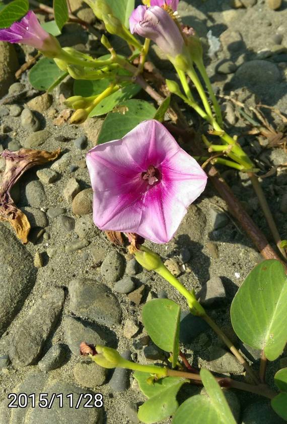 特徵:通常長於海邊的沙灘,紫色、粉紅色的花,外觀看起來像牽牛花,葉子是羊蹄的形狀(羊蹄甲)中文名稱:馬鞍藤學名:Ipomoea pes-caprae英文名稱:bayhops, beach morning glory or goat's foot原產地:太平洋、大西洋、印度洋的海邊沙灘