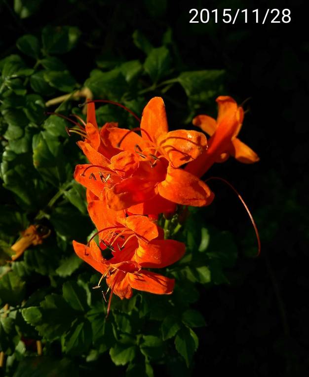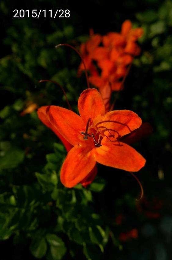 特徵:橘紅色長條形的花,花蕊很長&外露。外形類似金銀花。中文名稱:南非火焰花、南非小火焰 (與火焰木同科)學名:Tecoma capensis英文名稱:Cape honeysuckle原產地:非洲南部(南非、莫三比克)