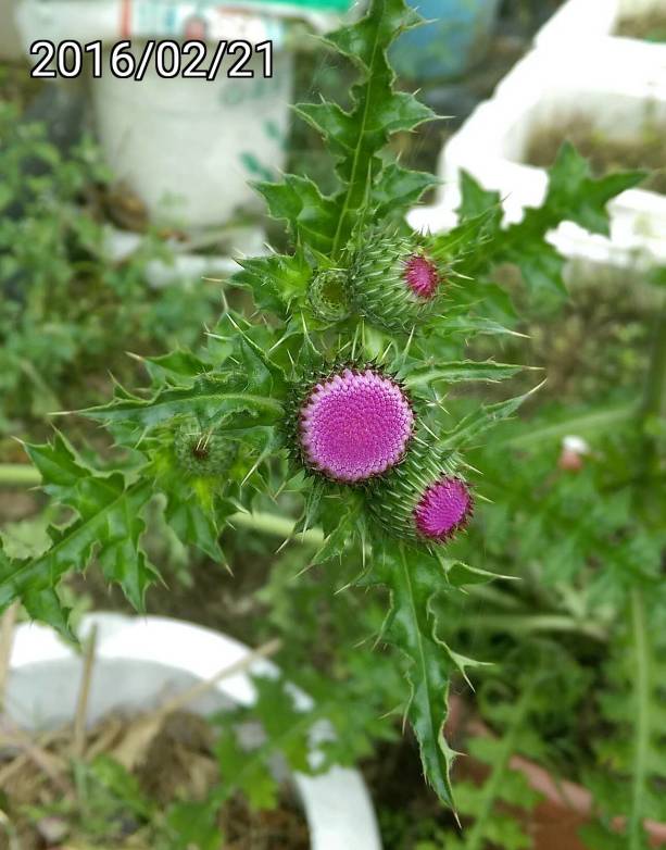 特徵:帶刺的葉子、粉紅色紫色的花,形狀類似蒲公英。種子的形狀也類似蒲公英的羽毛種子。同屬菊科的植物。切斷莖與蒲公英一樣會流出白色的汁,所以稱乳薊、奶薊 一般從乳薊、牛奶薊milk thistle種子萃取出的 silymarin 是一種被認為肝臟的保健成份。不過有研究說口服 silymarin 對肝臟保健幫助不大。 使用 HTC Desire Eye + AndCamera 拍攝/打上日期文字/銳利化/調整色彩濃淡/裁剪 |