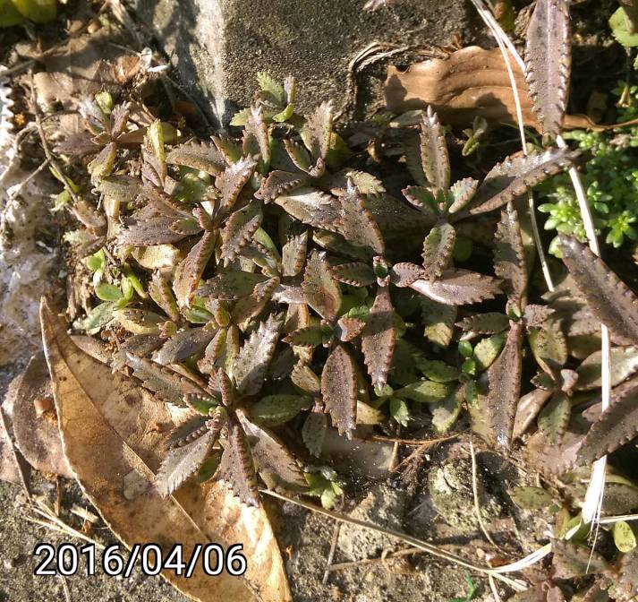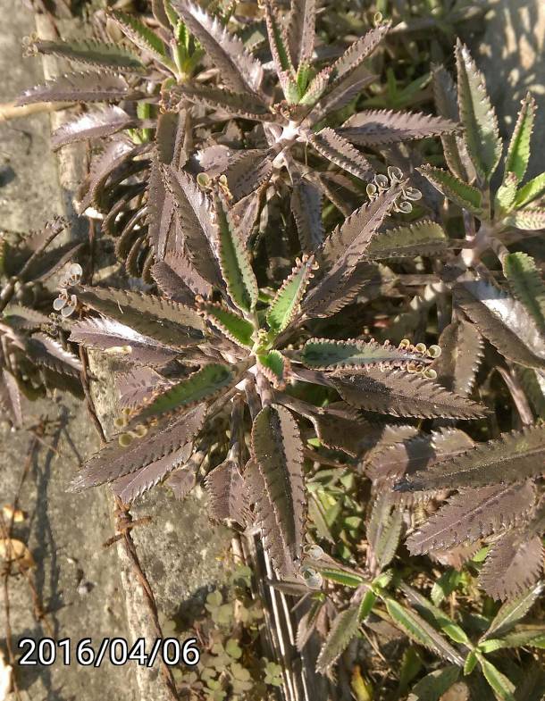 這是小寬葉不死鳥。這種不死鳥似乎繁殖力是最強的。 不過在一般草地繁殖力不是那麼強,因為一般的野草長得比不死鳥快又高,不死鳥的幼苗容易被草地覆蓋。但是陽台、屋頂就要小心了,少許泥土、乾旱的環境,沒有植物能與不死鳥競爭。 這種小葉的不死鳥看起來真的有夠醜陋。 使用 HTC Desire Eye + AndCamera 拍攝/打上日期/銳利化/裁剪 | |||||||||||