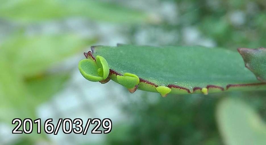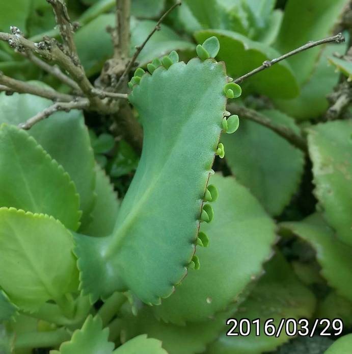 特徵:厚片波浪狀的葉子,邊緣長出幼苗,落地成為新的一棵 這種大葉不死鳥繁殖力就很強了。繁殖力更強的是小葉有斑點那一種不死鳥,隨便的屋頂,有一點泥沙就能長,不過外觀不如大葉不死鳥討喜。為何不死鳥那麼耐旱?因為與仙人掌一樣是用 CAM Crassulacean acid metabolism (景天酸代謝) 的光合作用,夜間氣孔打開,吸收二氧化碳,合成有機酸。白天氣孔關閉,減少水份蒸發。不死鳥是景天科的植物。 使用 HTC Desire Eye + AndCamera 拍攝/打上日期/調整顏色/銳利化/裁剪