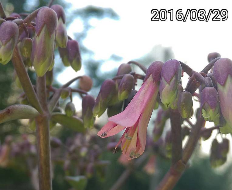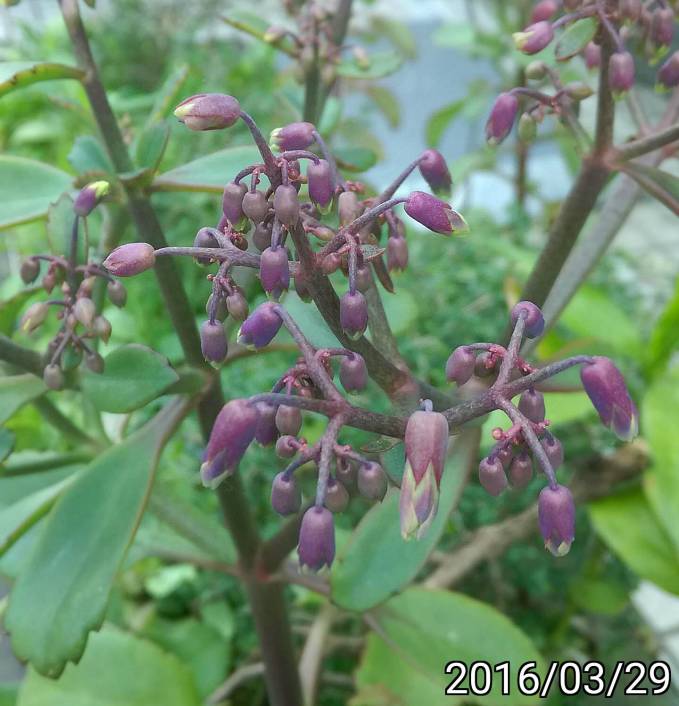 小葉的不死鳥有分寬葉(橢圓形)、窄葉(棒狀葉)(洋吊鐘 Bryophyllum delagoense, mother of thousands, mother of millions, and devil's backbone.) 兩種。 洋吊鐘 Bryophyllum delagoense 的花看起來很漂亮,葉子的顏色很醜,繁殖力超強,不要隨便種植。洋吊鐘 Bryophyllum delagoense, mother of thousands, mother of millions, and devil's backbone. 含有一種心臟的毒素稱為 bufadienolide cardiac glycosides,羊或牛等草食動物誤食可能會造成傷害。 使用 HTC Desire Eye + AndCamera 拍攝/打上日期/調整顏色/銳利化/裁剪 | |||||||||||