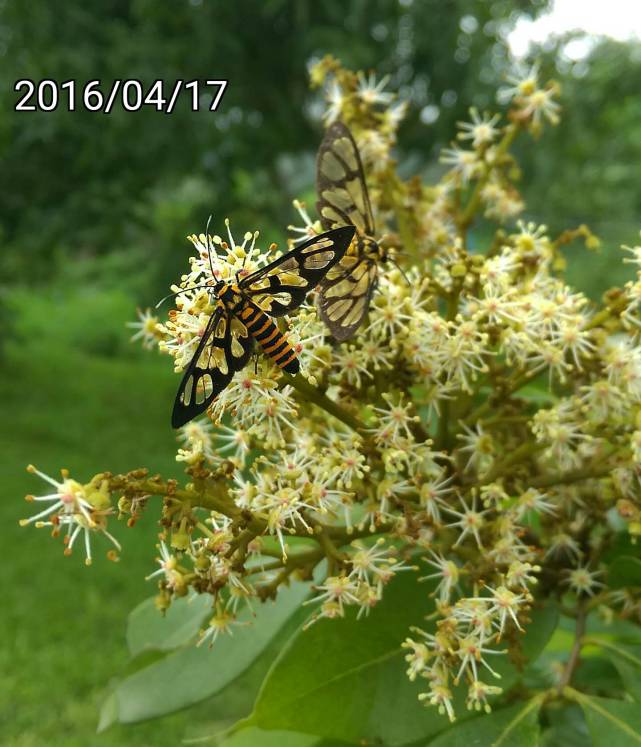 透明翅膀 棒狀觸角 黃腹鹿子蛾 Amata perixanthia 傳說中,蝴蝶與蛾的重要區別特徵是蝴蝶是棒狀的觸鬚,蛾是羽狀觸鬚。蝴蝶是晝行性,蛾是夜行性。黃腹鹿子蛾 Amata perixanthia 都違反這兩個特徵。黃腹鹿子蛾 Amata perixanthia的身體很像蜜蜂的黃黑相間的條紋。黃腹鹿子蛾 Amata perixanthia與蜜蜂一樣,是吸花蜜的。 使用 HTC Desire Eye + AndCamera 拍攝/打上日期/銳利化/裁剪 |