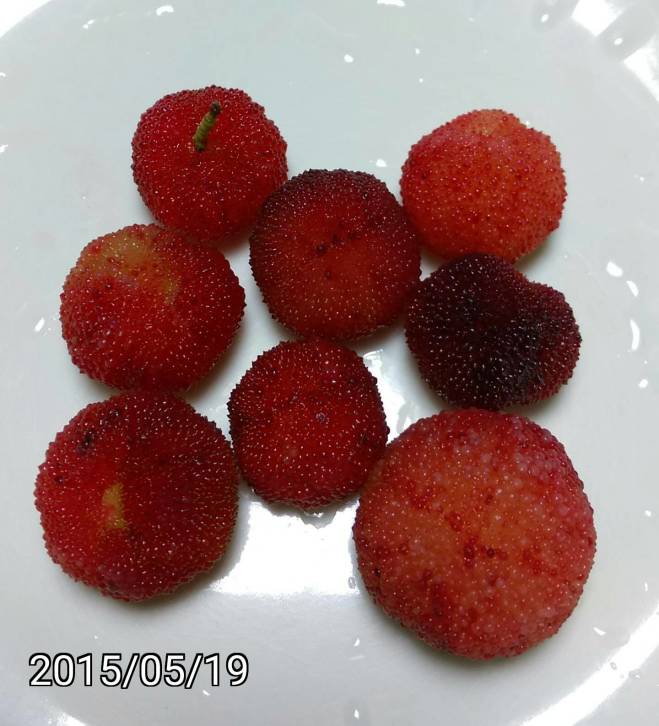 還好後來還有一些結楊梅、樹梅的果實、fruits of Myrica rubra, Chinese Bayberry, Japanese Bayberry, Red Bayberry, Yumberry, Waxberry。楊梅、樹梅的花與桑椹、構樹一樣是長在果實的表面的,照片上黃色的絨毛。可以看到新長出來的嫩枝是不長果實的,只有成熟的枝才會長。 使用 HTC Desire Eye + AndCamera 拍攝/打上日期文字/裁剪/銳利化 |