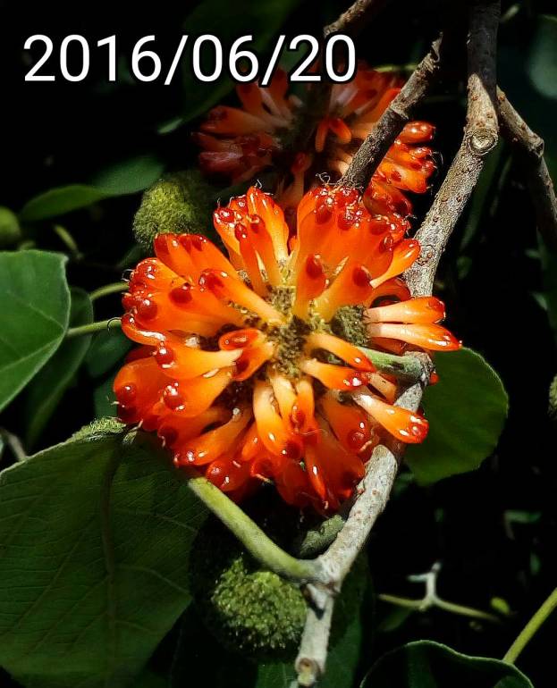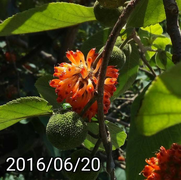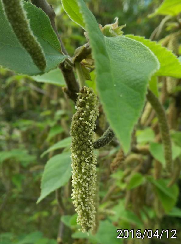 構樹是有分公的母的(雌雄異株)。最近是構樹開花的旺季。構樹看起來是風媒花,也就是由風把花粉帶給雌花。一顆構樹會長滿了雄花來產生大量的花粉。雌花也就不需要那些花瓣、花香來吸引蜜蜂 or 蝴蝶了,只需要外露的雌蕊。 使用 HTC Desire Eye + AndCamera 拍攝/打上日期/銳利化/裁剪 | |||||||||||