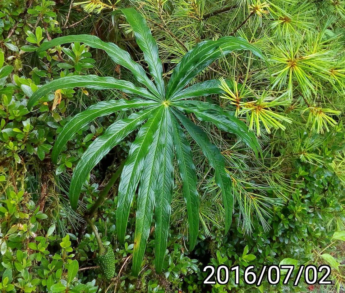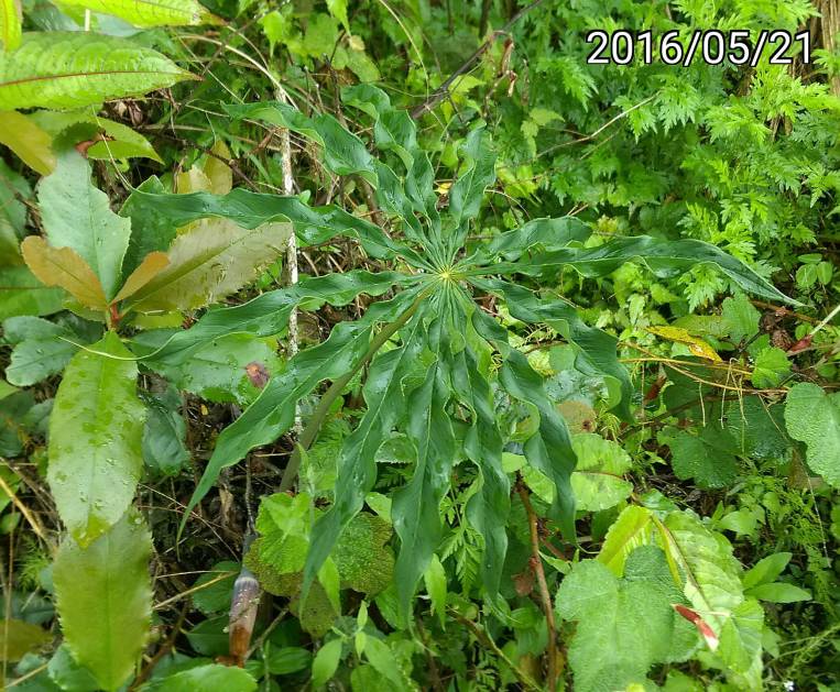 特徵:像雨傘骨架的放射狀葉子,葉子成波浪狀捲曲中文名稱:長行天南星學名:Arisaema consanguineum原產地:東亞、東南亞。台灣分布於低中海拔的山上