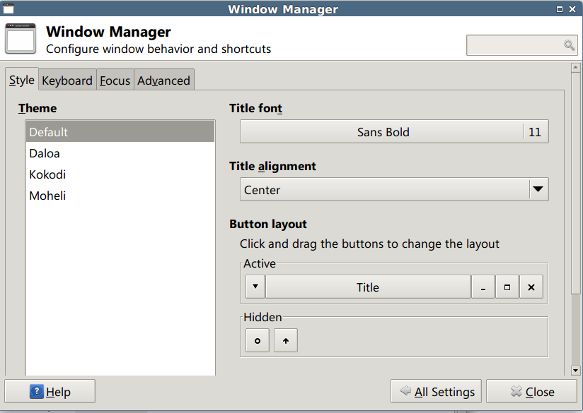 settings manager -> Window Manager -> Style 可以自訂window title bar的按鈕。用滑鼠抓按鈕放到hidden列就好了。如圖 | |||||||||||||