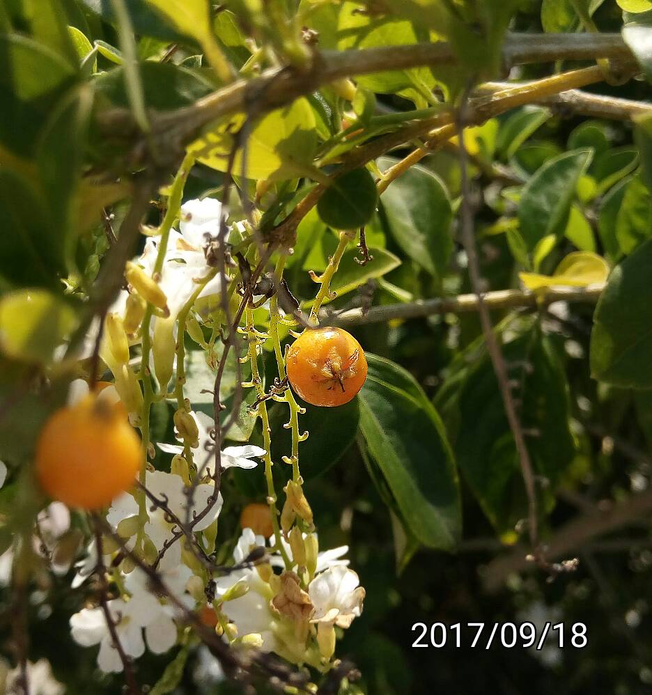 特徵:紫色花、橘色果實中文名稱:金露花學名:Duranta erecta英文名稱:golden dewdrop, pigeon berry, skyflower