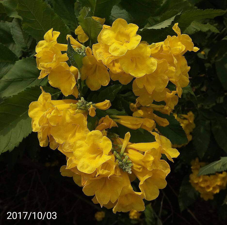 特徵:小喇叭形狀的黃花中文名稱:金喇叭木、黃鐘花學名:Tecoma castanifolia英文名稱:yellow trumpetbush, yellow bells, yellow elder, ginger-thomas原產地:厄瓜多、祕魯
