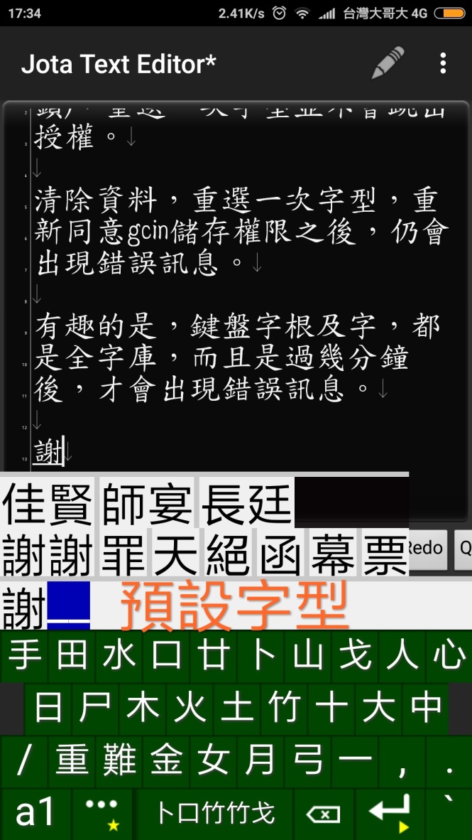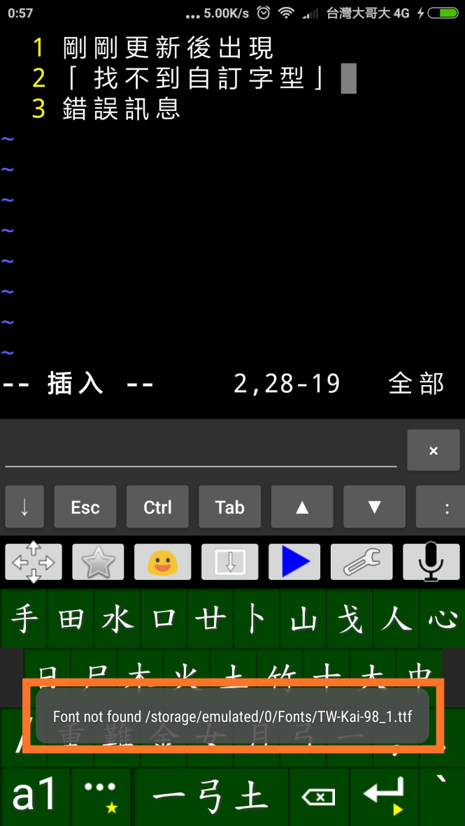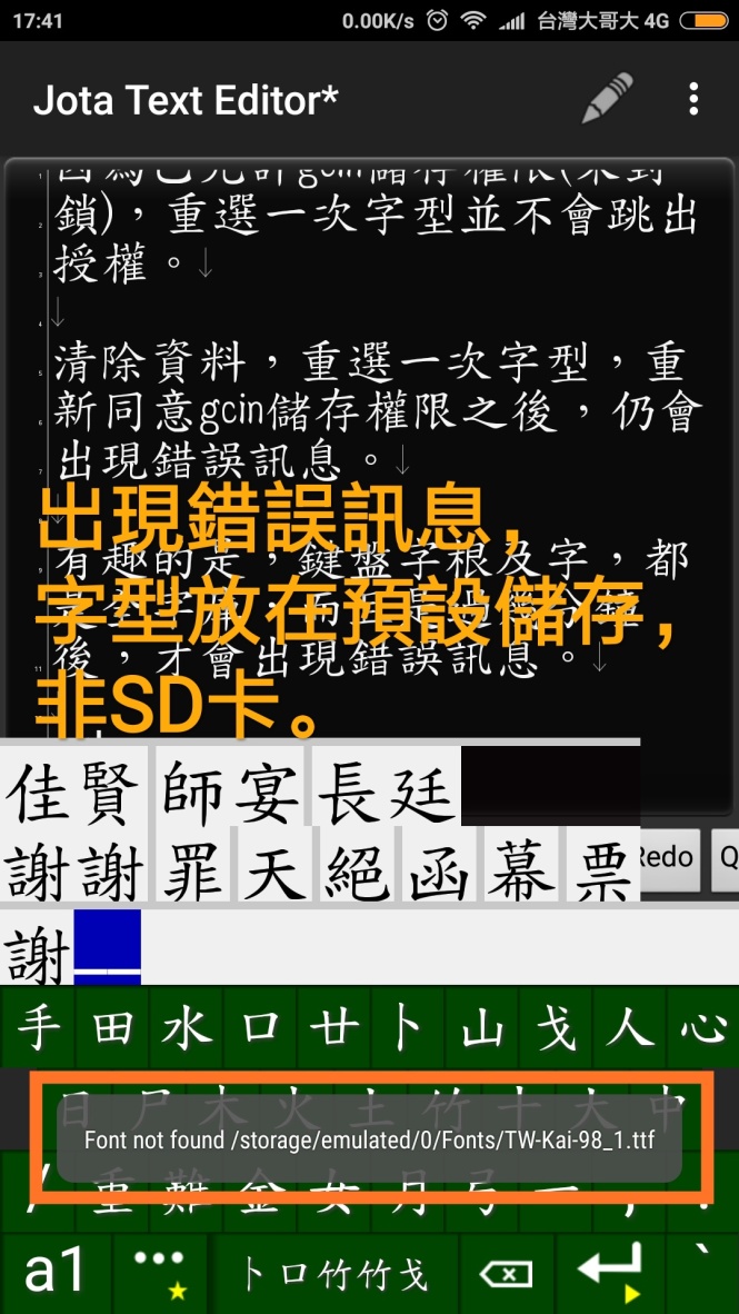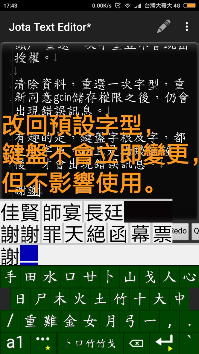給視覺系的人用的,不是實用第一的。 最新的 gcin Android 可以使用 自備字型(.ttf, .ttc),從網路下載到外部儲存例如 /sdcard, 或是直接copy 一份到 SD 卡.