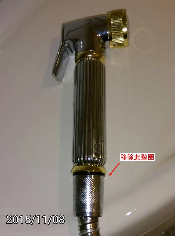 衛登豐 免痔衛生清洗器 W-201 直接裝在我的水管上會漏水,原因是這個噴頭的螺絲紋較短,壓不到水管螺帽的墊圈。可以用底下的方式解決。
