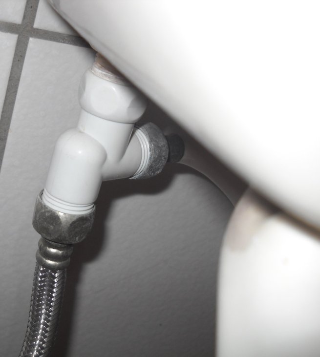 如果不幸買到自己動手族的這一種塑膠T形頭的,也可以考慮裝在馬桶水箱底下。或是把馬桶水龍頭拆下來再裝,工程浩大。