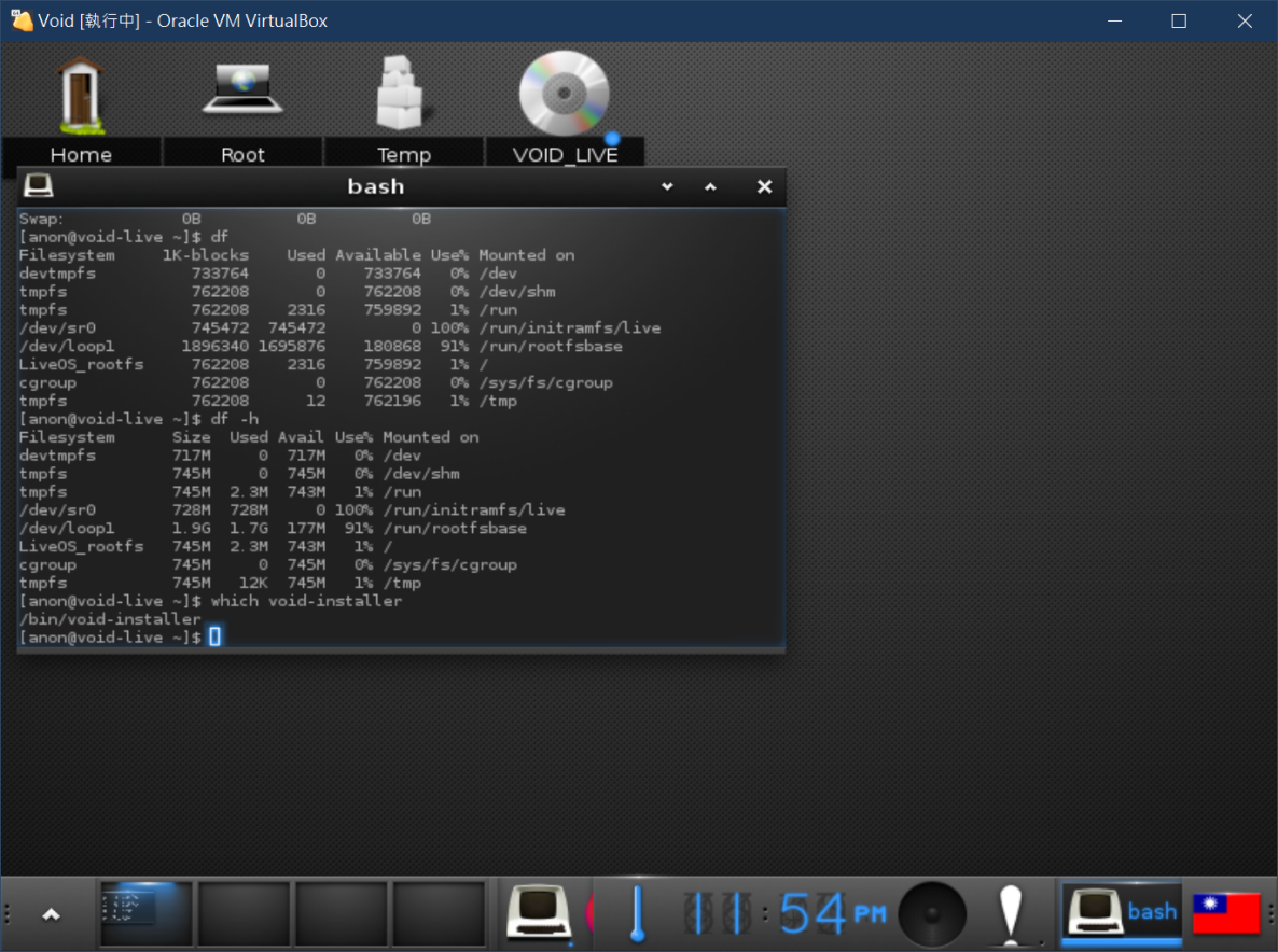 【補充】 Tue Feb 2 10:31:11 CST 2021 live 裡頭並沒有很好的中文字型,之後需要自行安裝中文字型,先查詢後再裝: xbps-query -Rs *font* 看其中有沒有適當的字型(Google Noto 是一定會有)。別急著 copy 自己的字型 到系統裡頭。 | |||||||||||
